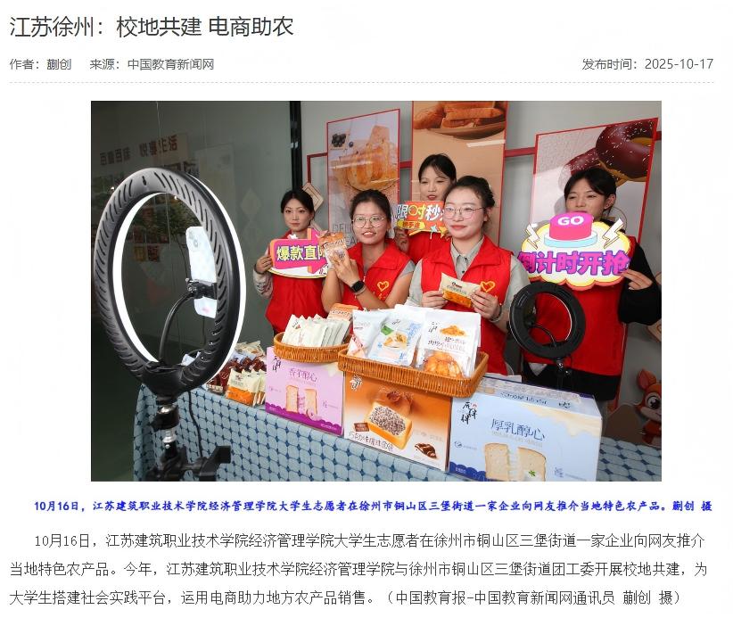 本次活动是学院与徐州市铜山区三堡街道团工委校地共建的重要一环。学生们深入地方企业,充分发挥专业特长,通过现代化的电商直播手段为本土农产品拓宽销路,将理论知识应用于真实的商业场景,打造了一个鲜活的社会化实践平台。
