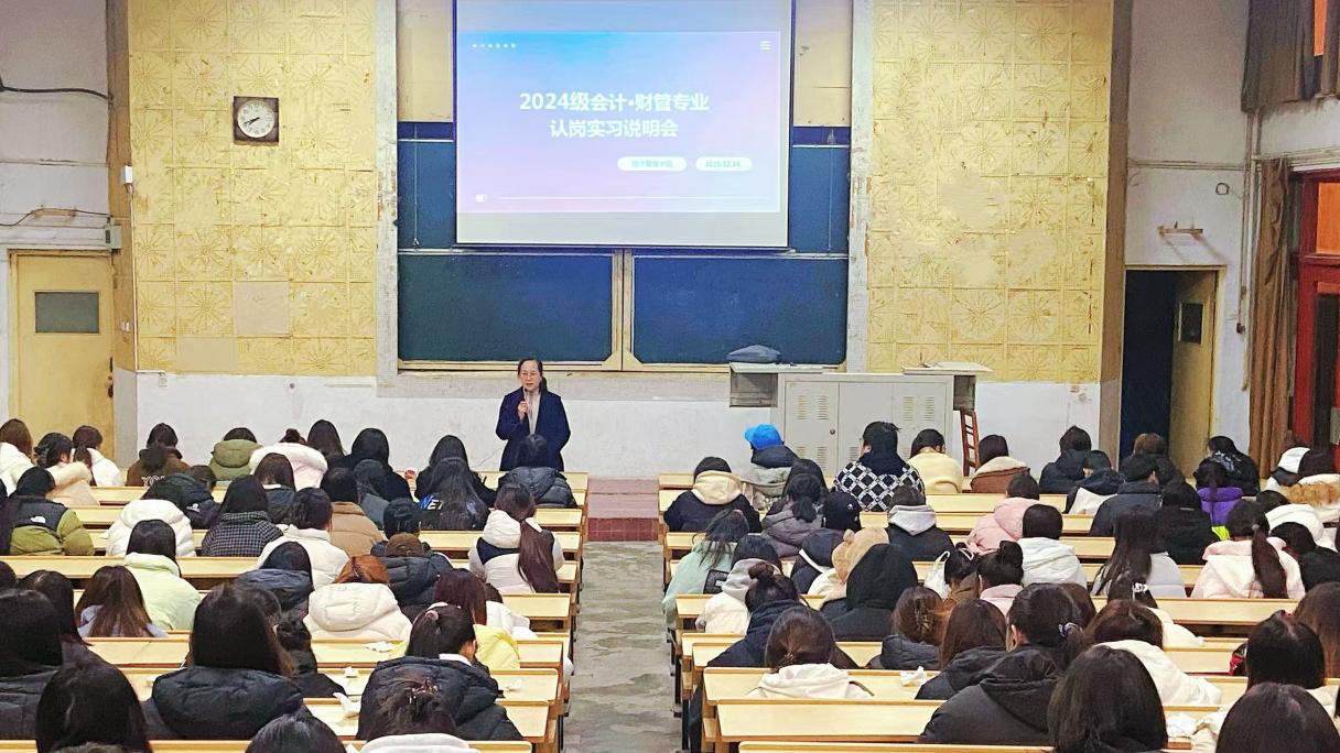 12月16日,大数据与会计、大数据与财务管理专业于东阶梯教室召开2024级认岗实习动员大会暨 “职业道德与工匠精神” 专题讲座。学院党总支书记李国琴、大数据与会计专业主任赵旸、大数据与财务管理专业主任单雅迪及24级全体学生参会。