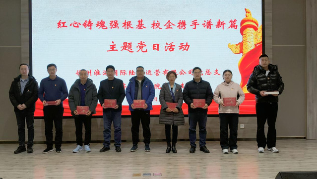 为深入学习贯彻党的二十届四中全会精神,推动党建引领下的校企资源共享和优势互补,12月23日下午,学院党总支与徐州淮海国际陆港运营有限公司党总支联合举办“红心铸魂强根基 校企携手谱新篇”主题党日活动。陆港集团党委委员、纪委书记吴传东,校党委委员、党委组织部部长、党委统战部部长宋丹萍,校纪委副书记、纪委办公室主任朱晖出席活动。徐州淮海国际陆港运营有限公司党总支和学院党总支全体党员参加。活动由学院党总支书记李国琴主持。