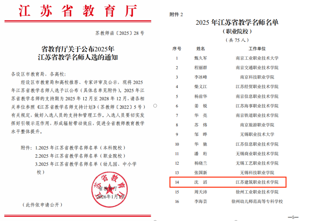 近日,江苏省教育厅公布2025年江苏省教学名师人选名单,我院教师沈滔成功入选。