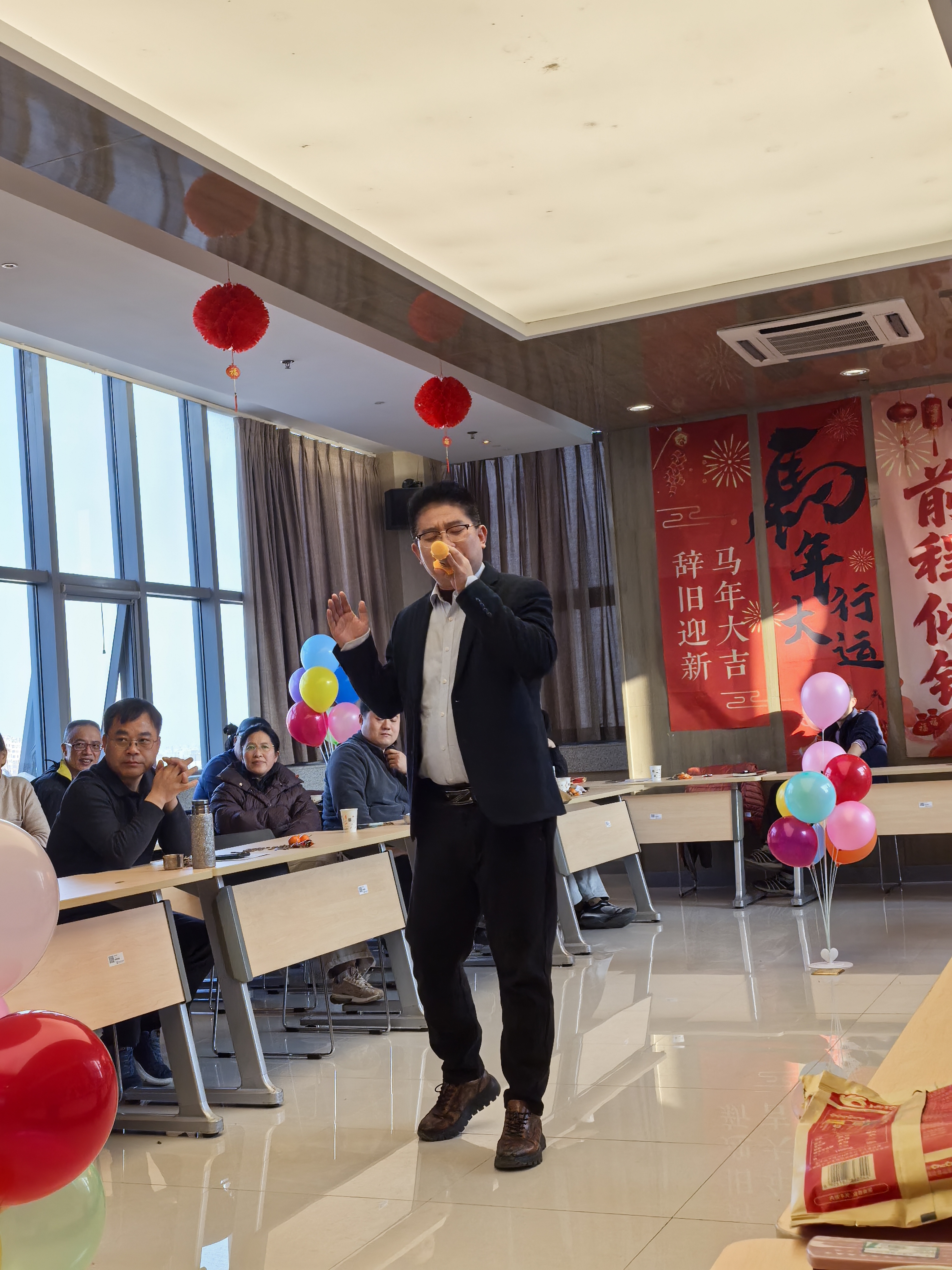 紧接着,一场政治理论学习测试与教师倾心编排的节目交替展开,现场气氛热烈。测试内容聚焦党的二十届四中全会精神、职业教育理论、师德师风建设、廉洁知识、学校规章制度等。物流教研室一曲《真心英雄》,唱响了经管人的团结与豪情。会计教研室的《三句半》,幽默诙谐,道出了专业特色与育人感悟。单雅迪老师深情演唱《如愿》,寄托了对未来的美好憧憬。崔廷锋老师的脱口秀《学院“内幕”大公开》,以轻松风趣的口吻盘点了学院年度亮点成绩,赢得了阵阵欢笑与掌声。胡欣哲老师主持的“猜诗词”互动环节,增添了浓厚的文化气息。酒店教研室的《赞经管》,通过艺术化表达,生动展现了学院教师团结协作、砥砺前行的奋进画卷。王传彬老师倾情演唱《你》,以此曲致敬每一位在平凡岗位上默默奉献的教师,温暖人心,将现场气氛推向高潮。