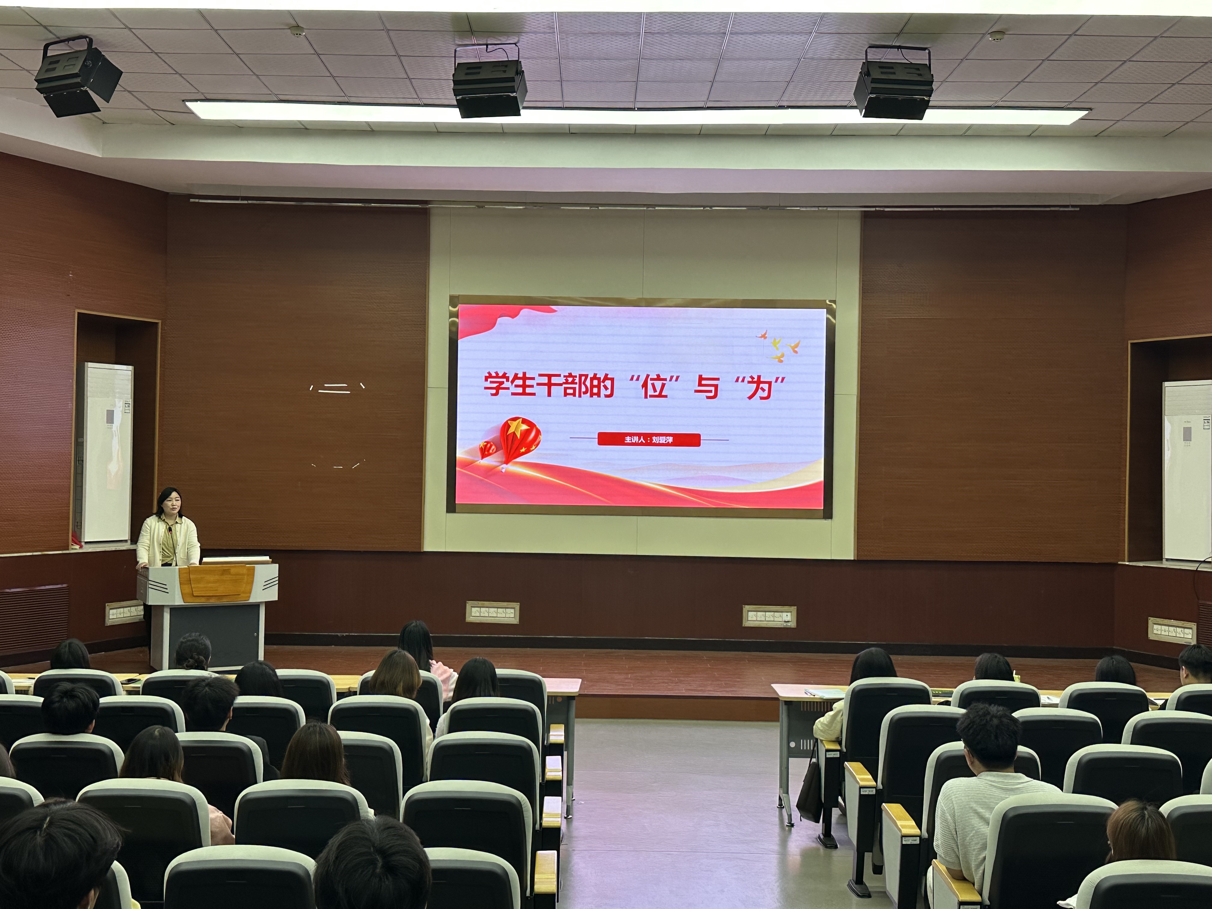 讲座中,刘爱萍围绕“在其位”“有所为”“有所不为”三个层面展开阐述。她指出,学生干部是“一座桥、一面旗、一颗钉”——连接老师与同学,传递政策、反馈心声;在学习、纪律、品格上做标杆;扎根实际、服务身边人。她引导学生思考这一岗位带来的责任、视野与锻炼机会,鼓励大家珍视平台、主动成长。在行动层面,刘爱萍提出学生干部要练好“三板斧”,即沟通力、执行力和创新力,同时守住“主动不等待、团结不独揽”两种心态。她还特别提醒学生干部警惕“三浮”现象——浮躁、浮夸、浮表面,力戒形式主义和功利心态,牢牢守住纪律红线、道德底线、安全防线三条线,做到心中有尺、行有所止。讲座最后,刘爱萍寄语全体学生干部:“位是舞台,不为虚设;为是行动,不为空谈;你的成长,藏在你服务的每一件小事里。愿你们在未来的日子里——定位自己,创造价值,成为一束照亮他人的光。”