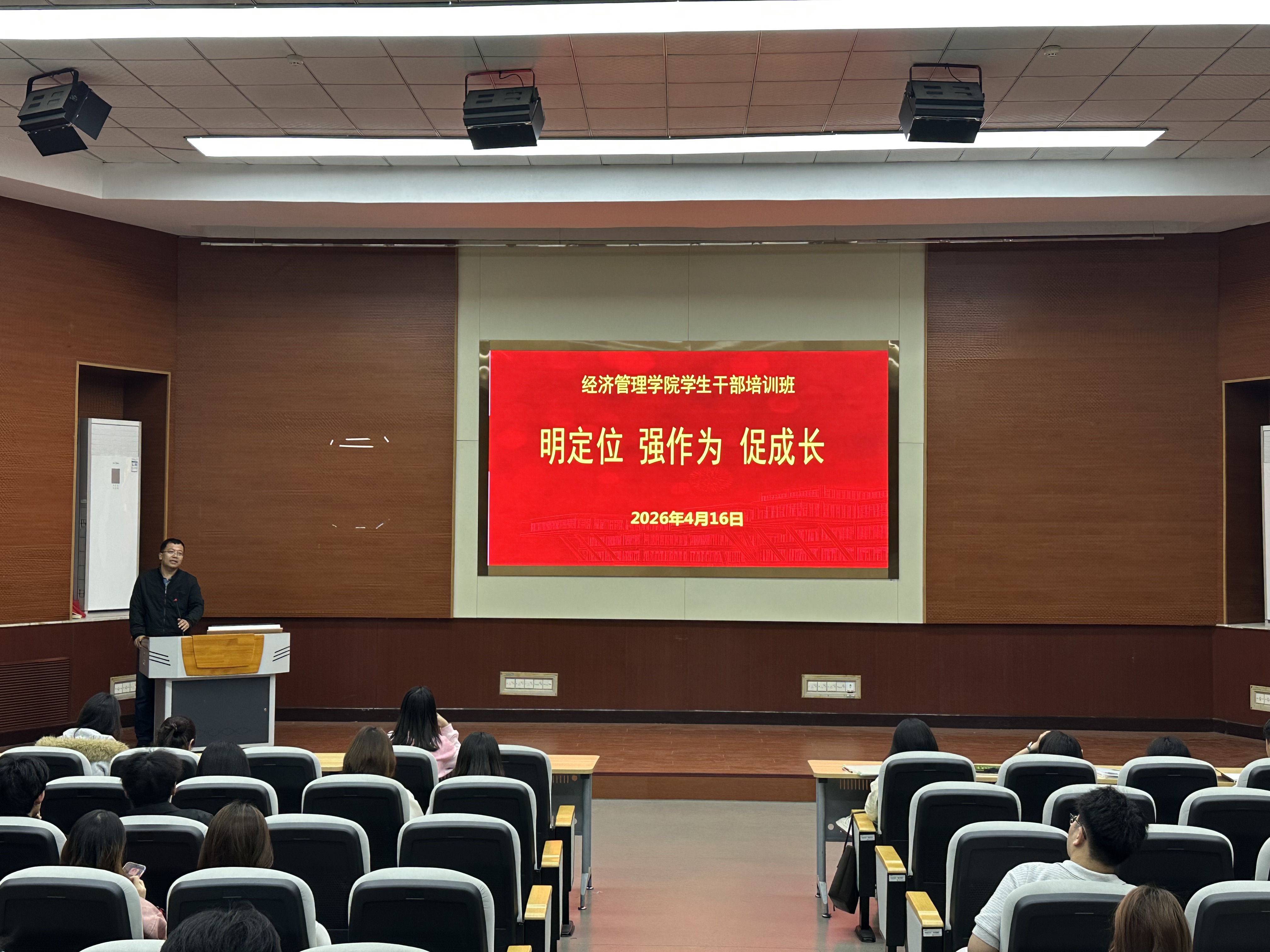 为进一步加强学生干部队伍建设,提升学生干部的综合素质与履职能力,4月16日晚,学院在创翼学堂举行“明定位 强作为 促成长”学生干部培训讲座。讲座邀请学工处副处长刘爱萍老师作题为《学生干部的“位”与“为”》的专题报告。报告由学院党总支副书记崔廷锋主持,全院学生干部代表及第62期入党积极分子培训班学员共70余人参加。