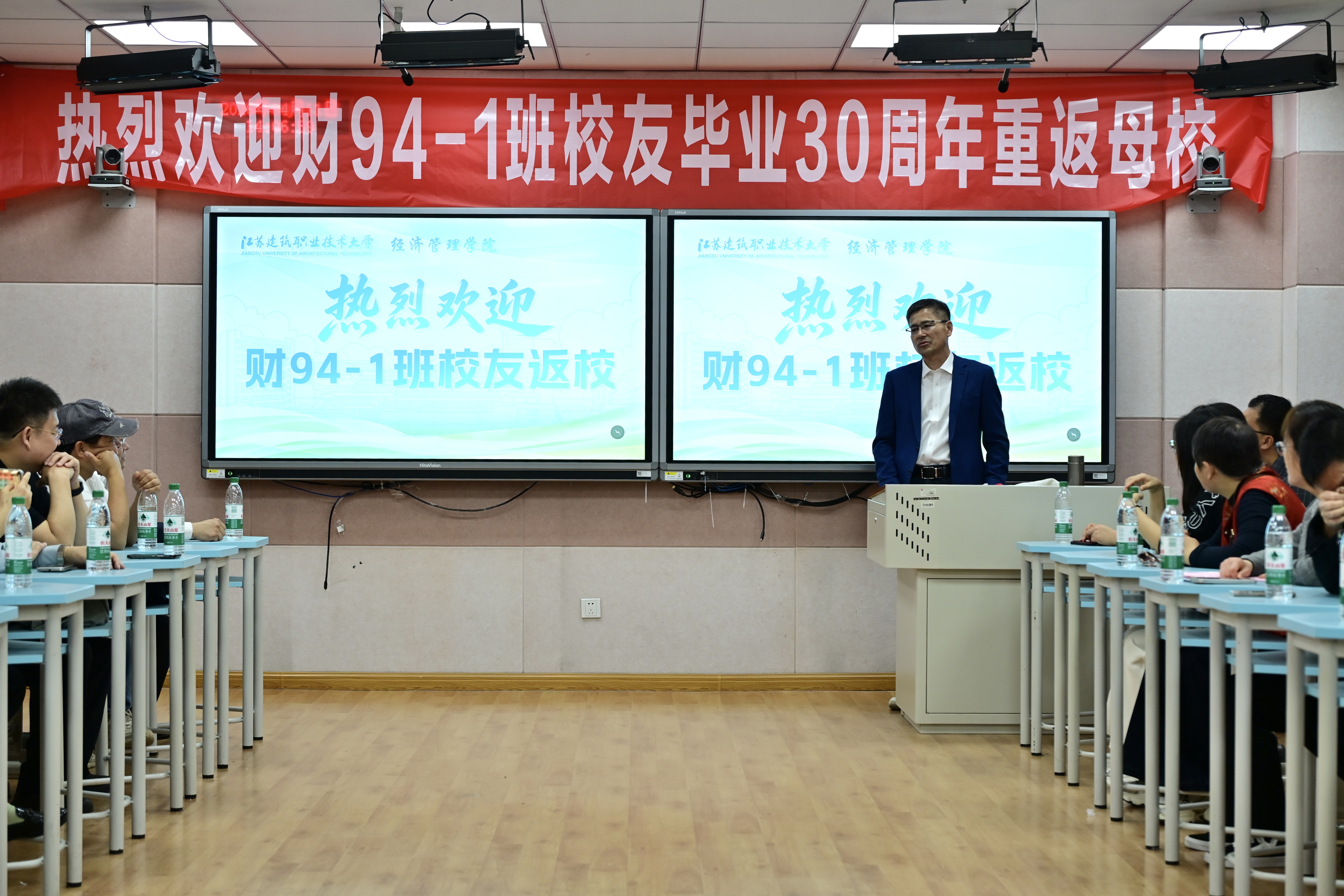 随后,徐州工业职业技术学院党委委员、副院长,财94-1班班主任曾凡远缓缓走上台,教室里顿时响起热烈的掌声。他深情回忆当年与同学们相处的点滴时光,为大家在各自岗位上取得的成绩感到骄傲,勉励大家珍惜同窗情谊,继续保持在学校时那股不服输的劲头,用自己的专业知识和能力,为社会做出更大的贡献。